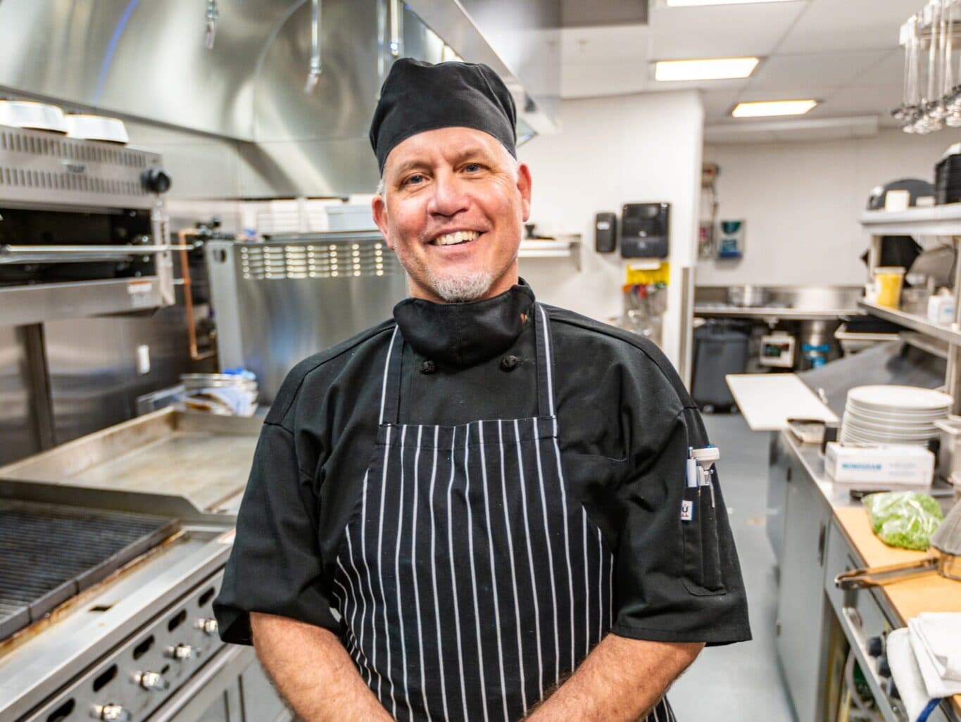 A Mirabella chef puts final touches on a plate of dessert.